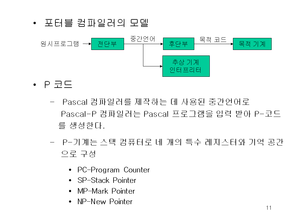 – Pascal 컴파일러를 제작하는 데 사용된 중간언어로