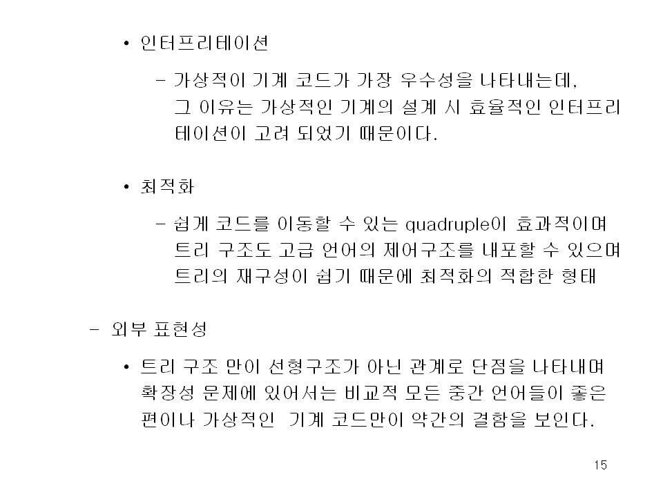 최적화를 위해서는 부적합한 중간 언어이다.